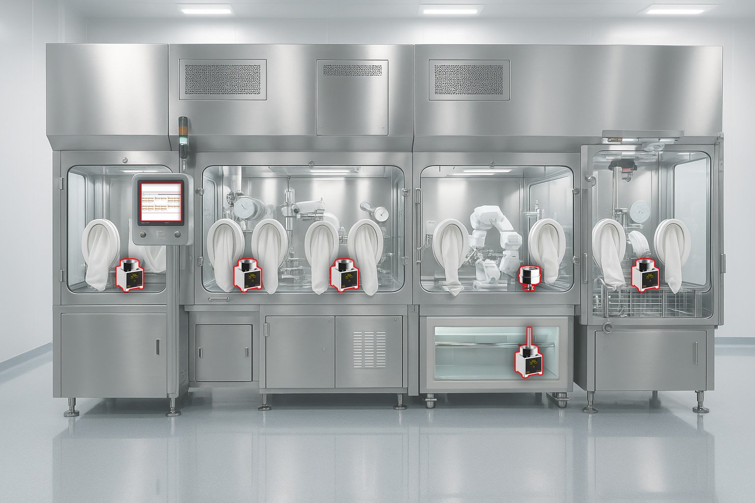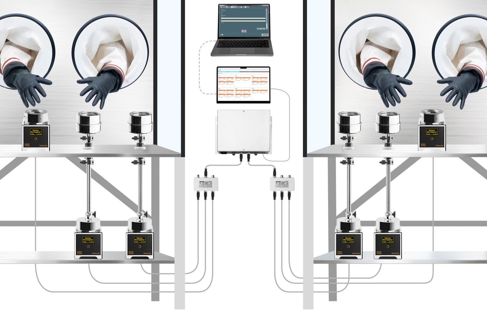 Exemplo de SISTEMA GENIUS em 2 isoladores RABS. O sistema é composto por 2 satélites GENIUS e 4 satélites GENIUS com cabeçotes remotos
