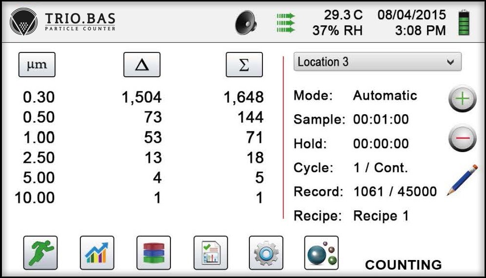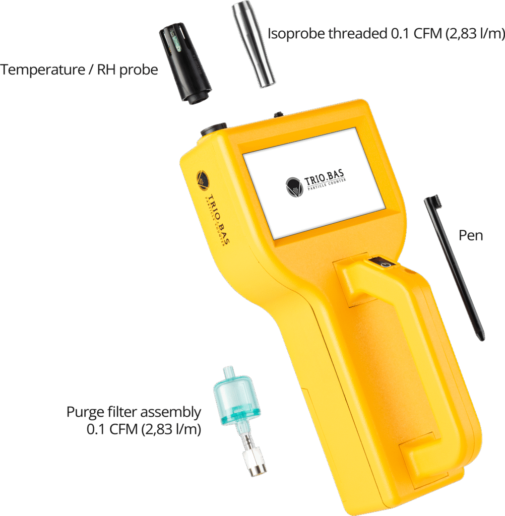 • O instrumento detecta partículas em uma faixa de 0,3 a 25 µm em 6 canais predefinidos (geralmente 0,3, 0,5, 1, 2, 5 µm). Ele opera com uma vazão de 0,1 CFM (2,83 l/min).