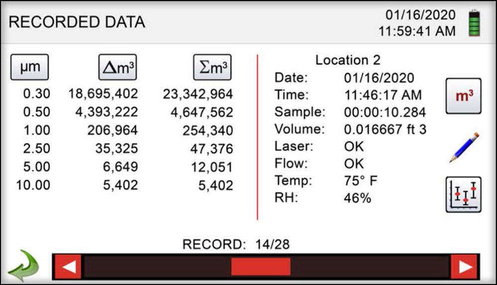 • Até 45.000 registros armazenados com contagens de partículas, dados ambientais, localizações e data/hora.